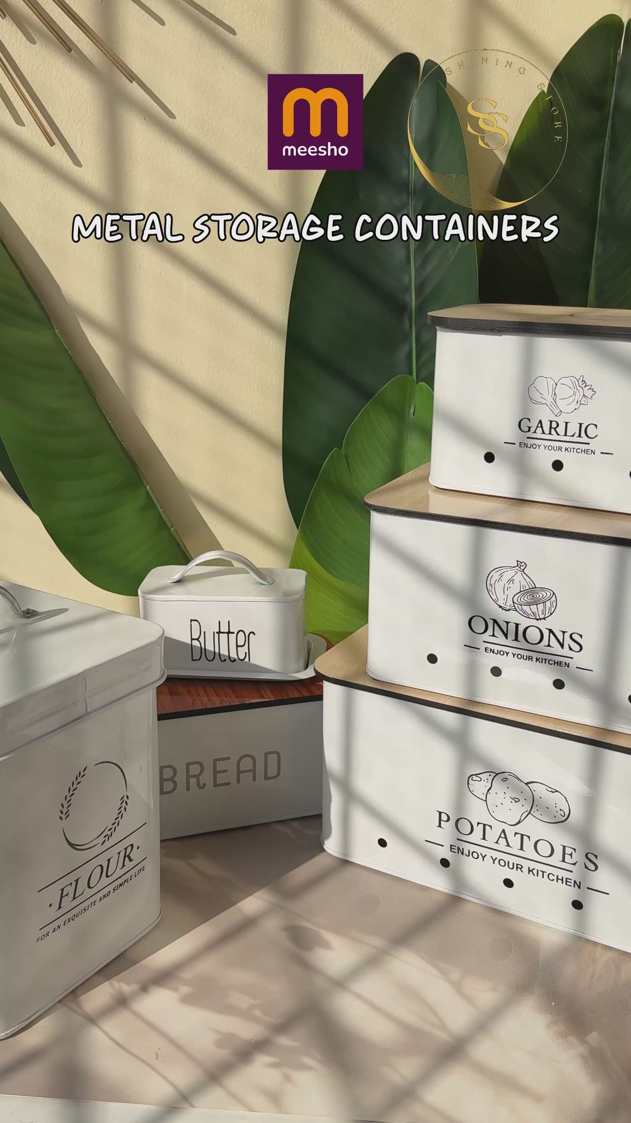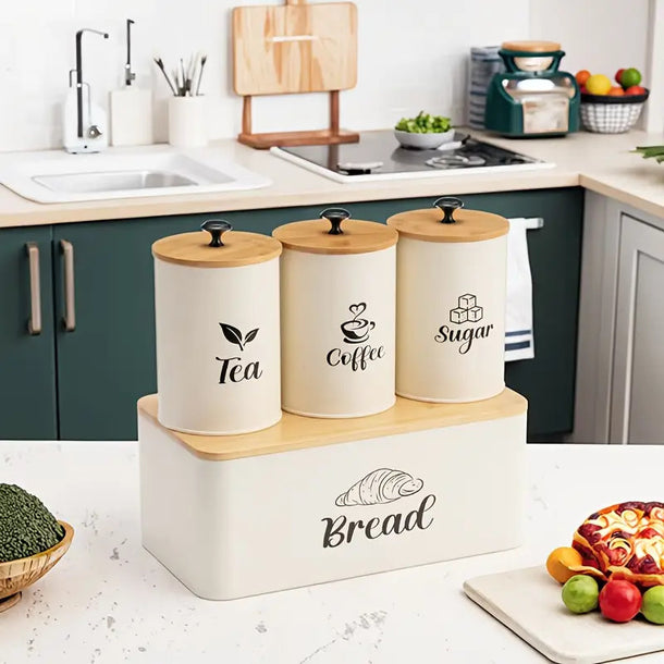 Shining Store 4-Piece Cream Metal Kitchen Storage Set | Large Bread Box & Tea, Coffee, Sugar Canisters with Bamboo Lids | Farmhouse Countertop Organizer & Food Containers